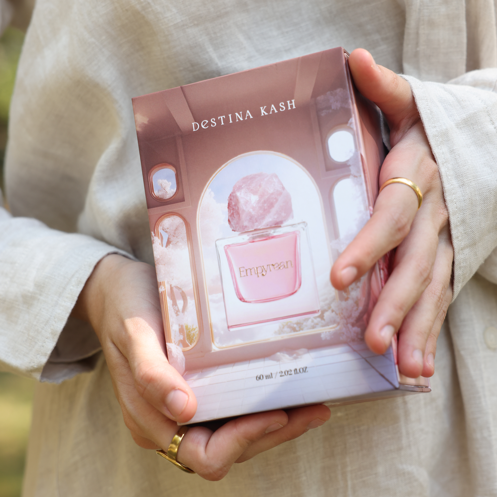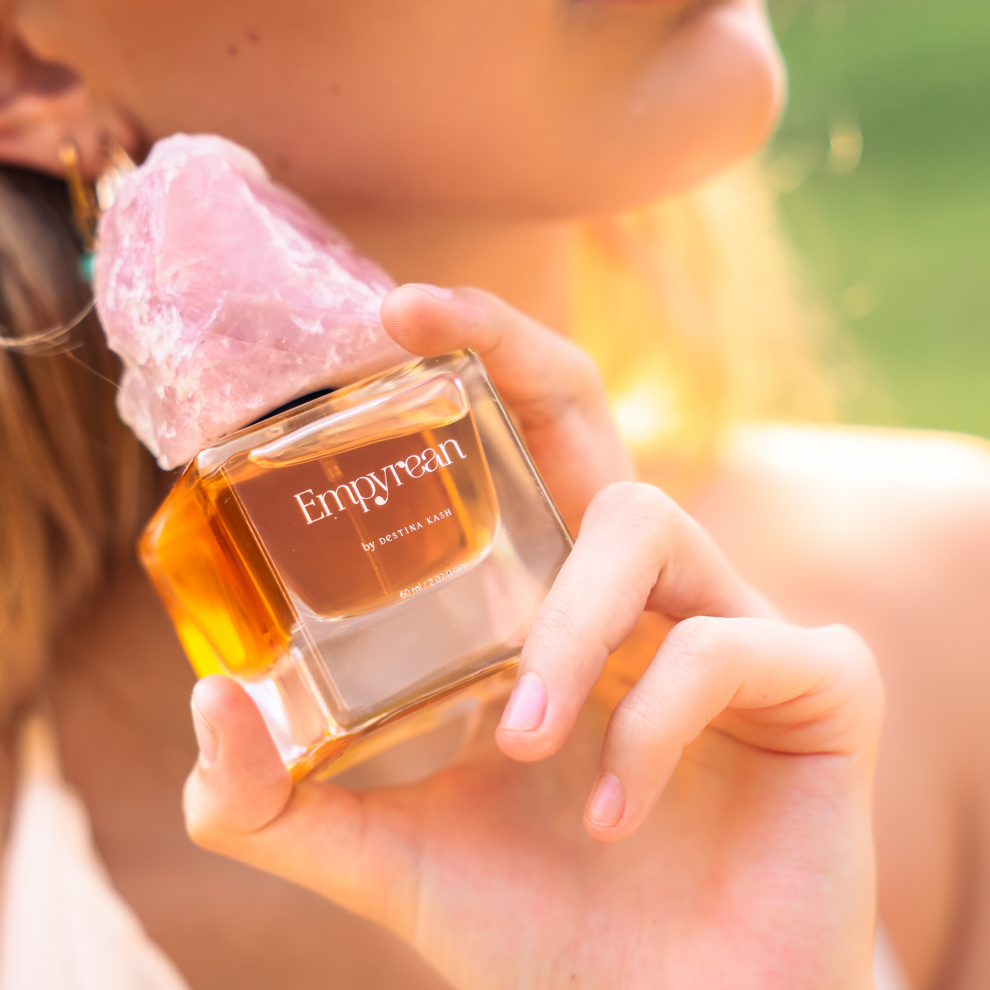 Housed in a recyclable glass bottle, Empyrean is crowned with an ethically sourced raw crystal cap — each one uniquely shaped by nature. The perfume is refillable, crafted with cold-pressed oils and a commitment to conscious luxury.